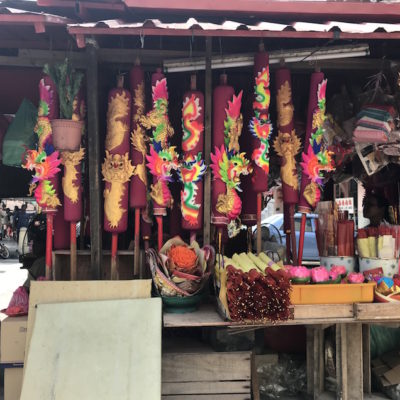 Le centre-ville de Georgetown est pavé de plusieurs temples chinois dont les plus connus sont le Khoo Kongsi (bouddhiste) et le temple de la Déesse de la Miséricorde, Guan Yin (taoïste). Autour du temple de Guan Yin, il est possible d’acheter de l’encens dans plusieurs boutiques, mais également, dans une ruelle un peu cachée (vous allez devoir la chercher car je ne me souviens plus exactement de son emplacement), vous croiserez l’atelier d’un artisan qui fabrique encore à la main les bougies et l’encens pour les offrandes aux temples.