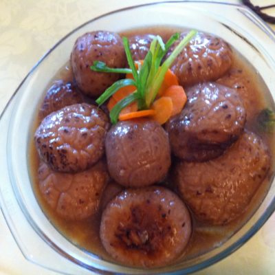 On va également manger des champignons parfumés normalement chers (les shiitake japonais). Aujourd’hui, ils sont devenus assez abordables, donc ce critère perd un peu de son sens. En revanche, en cuisinant avec ma mère cet après-midi, j’ai appris que ces champignons sont désormais artificiellement « modifiés » afin de présenter une surface craquelée, caractéristique très recherchée. Ce qui est plutôt rigolo, c’est qu’ils ressemblent ainsi à des carapaces de tortue : c’est un animal très important dans la culture chinoise car elle symbolise la longévité (évidemment, elles vivent vieilles). Mais cet animal représente aussi l’univers. Le bas de la carapace, c’est la terre. Son dos, le ciel. Et entre les deux, la chair : c’est l’humanité.
