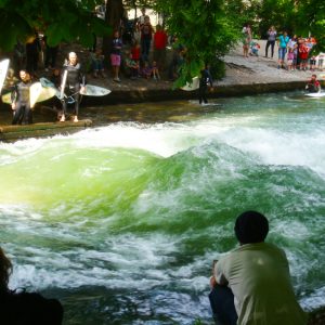 Dès mon arrivée, je me livre à un en-cas apparemment caractéristique de Munich. Je déjeune de bretzel et de fromage « Obatzda » au coeur du Beergarten de l’Englischer Garten, un immense parc s’étendant sur plus de 4 km² dans la ville-même. Je vous recommande, si vous passez par Munich l’été, de vous arrêter au bord du fleuve Isar qui traverse ce parc. Vous aurez de grandes chances d’y croiser… des surfeurs !! En effet, en un endroit précis du fleuve, le courant est assez fort pour produire des vagues, et je vous garantis que vous passerez un moment super fun à admirer les surfeurs sur les mini-vaguelettes d’un fleuve !